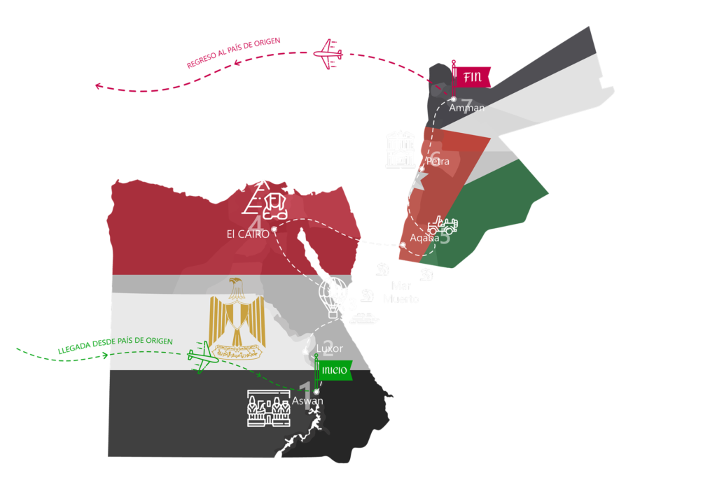 - Vuelos internacionales y transportes aeroportuarios llegando a Aswan (Egipto) y de salida desde Amman (Jordania)